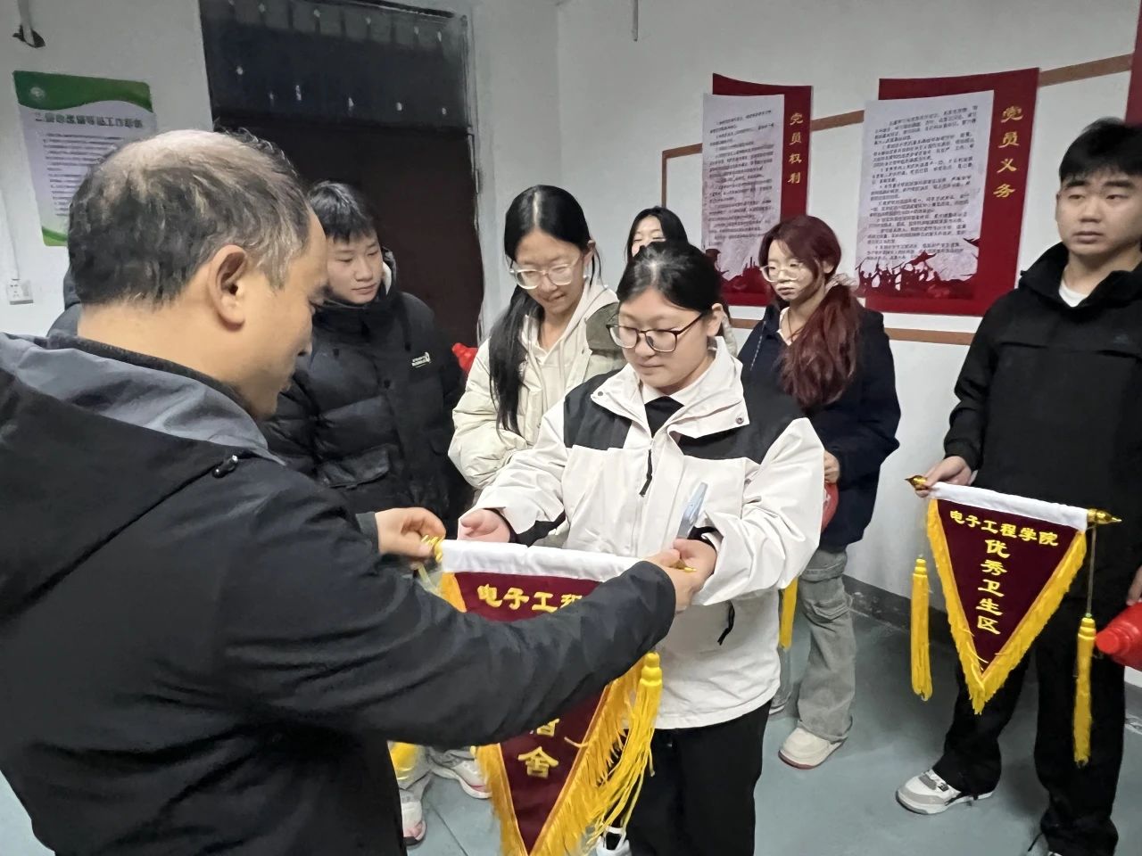 為不斷進一步增強電子工程學院學子們的衛(wèi)生意識和文明素養(yǎng),展現(xiàn)良好的校園形象,電子工程學院于2024年11月25日開展了“流動紅旗”評比活動。其中黨總支書記王正偉、學生支部書記李玲玲對上周優(yōu)秀宿舍頒發(fā)流動紅旗,各班級班長、團支書、學院生活部參與本次頒發(fā)儀式