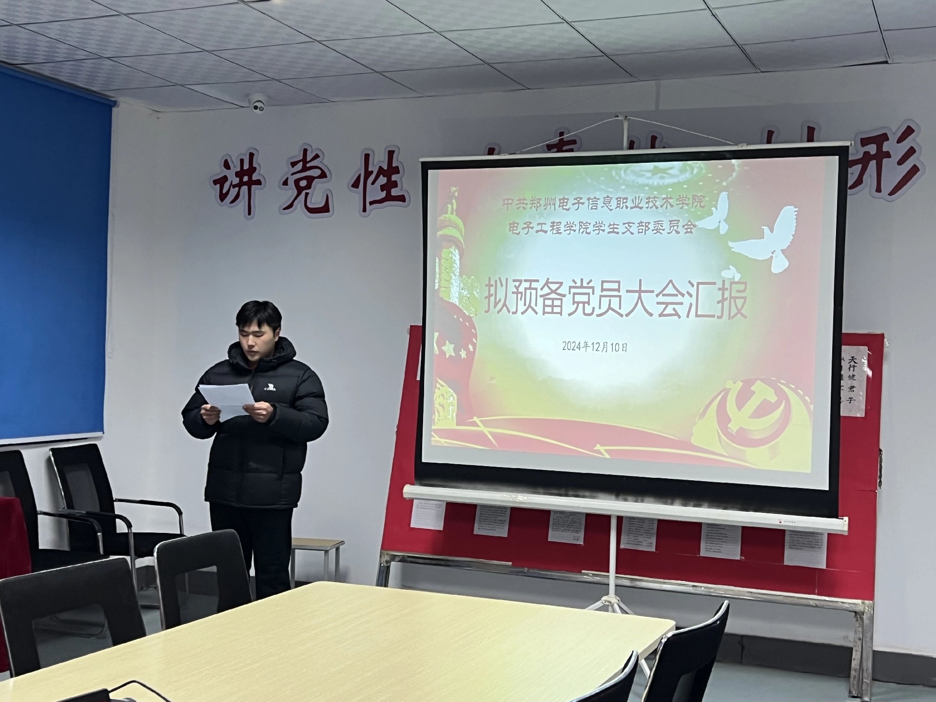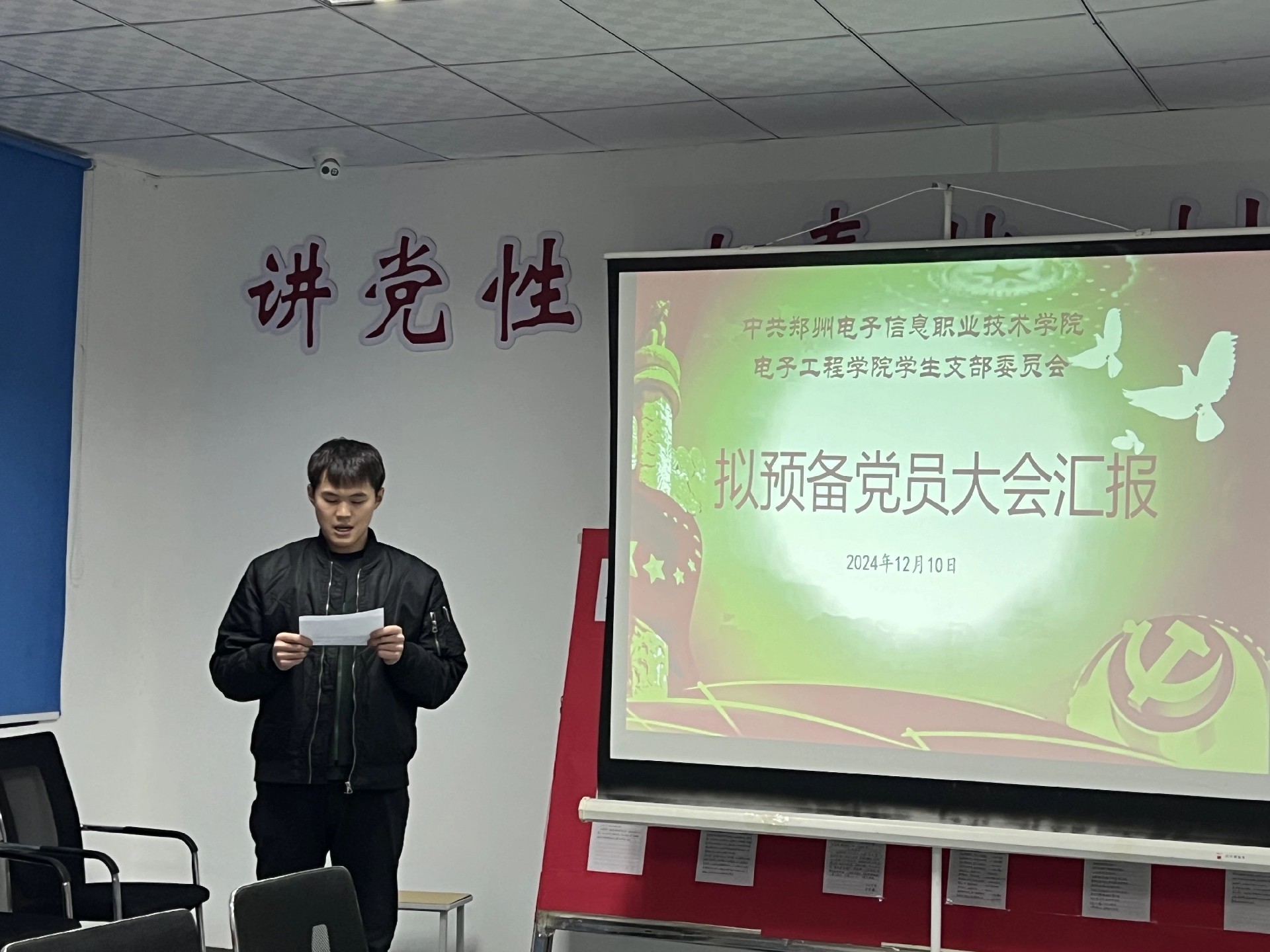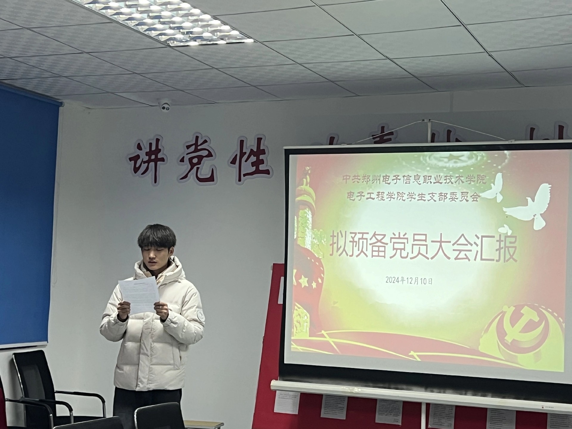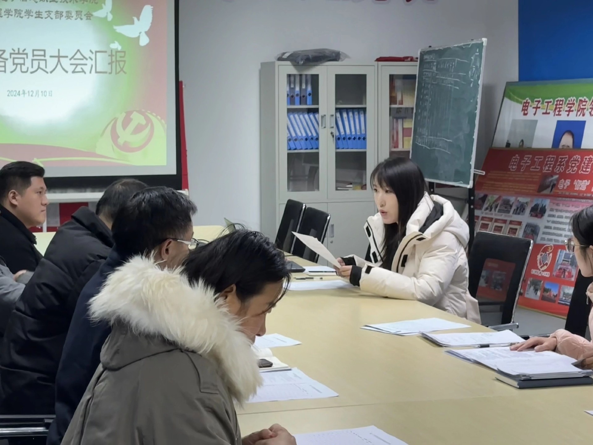 2024年12月10日電子工程學(xué)院在綜合辦公樓606會(huì)議室召開學(xué)生黨支部接收預(yù)備黨員大會(huì)。會(huì)議由學(xué)生黨支部書記李玲玲主持,電子工程學(xué)院黨總支書記王正偉、學(xué)生支部書記李玲玲、教工支部書記李冰乳,學(xué)院教師黨員同志及8名擬預(yù)備黨員參會(huì)。