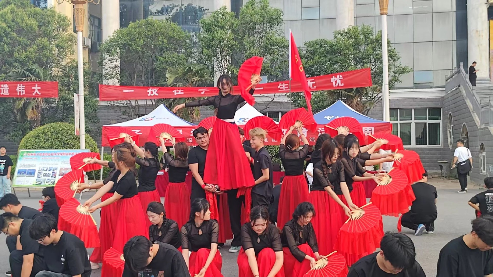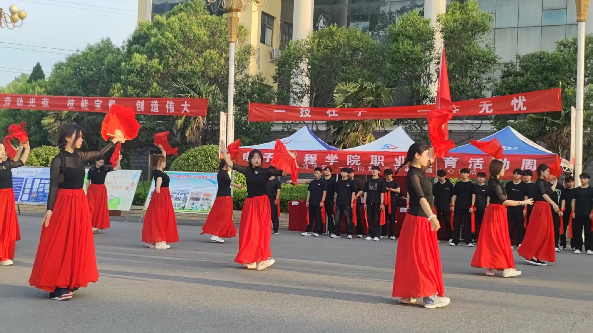 不僅如此,本次活動(dòng)還融合了《滿江紅》和《紅旗飄飄》的舞蹈,《滿江紅》舞蹈的激蕩為師生們都帶來了一場(chǎng)震撼心靈的視聽盛宴,他們用靈活的肢體語言,生動(dòng)的展示了岳飛將軍的精忠報(bào)國(guó)?!都t旗飄飄》旋律響起,鮮艷的紅扇在舞者們手中舞動(dòng),點(diǎn)燃了現(xiàn)場(chǎng)每一個(gè)人的愛國(guó)熱情。