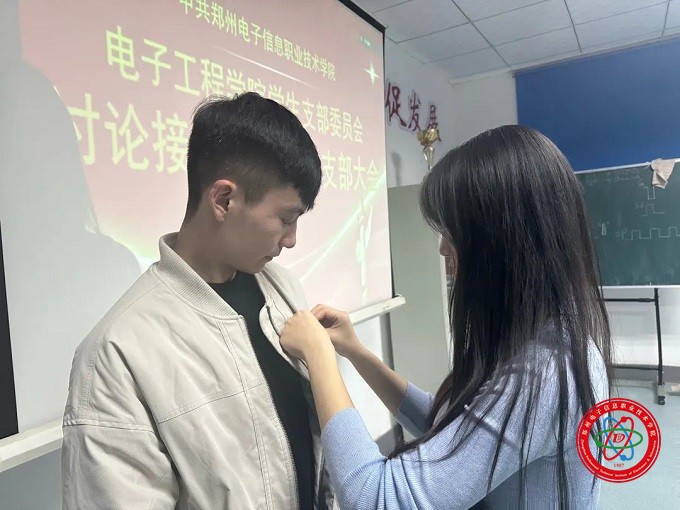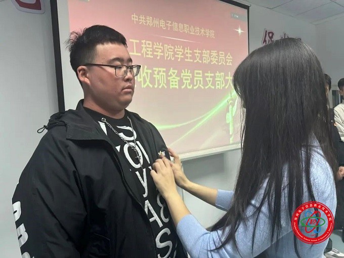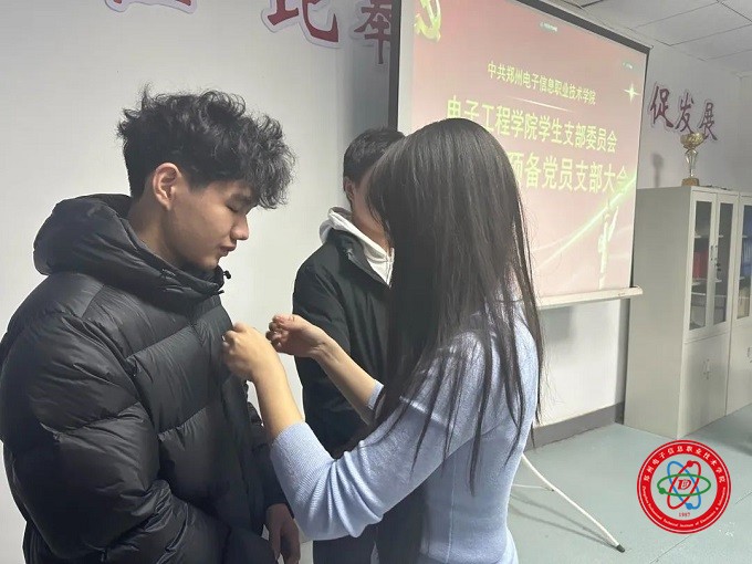 會議最后,預(yù)備黨員列隊整齊,學(xué)生黨支部書記李玲玲為在場的預(yù)備黨員佩戴上黨徽并希望他們:身為黨員要經(jīng)得起考驗,擔(dān)當(dāng)起自己責(zé)任,樹立先鋒模范作用,積極參與到實踐中去,投身于為人民服務(wù)中去;時刻堅定理想信念,保持謙虛謹慎,不驕不躁。