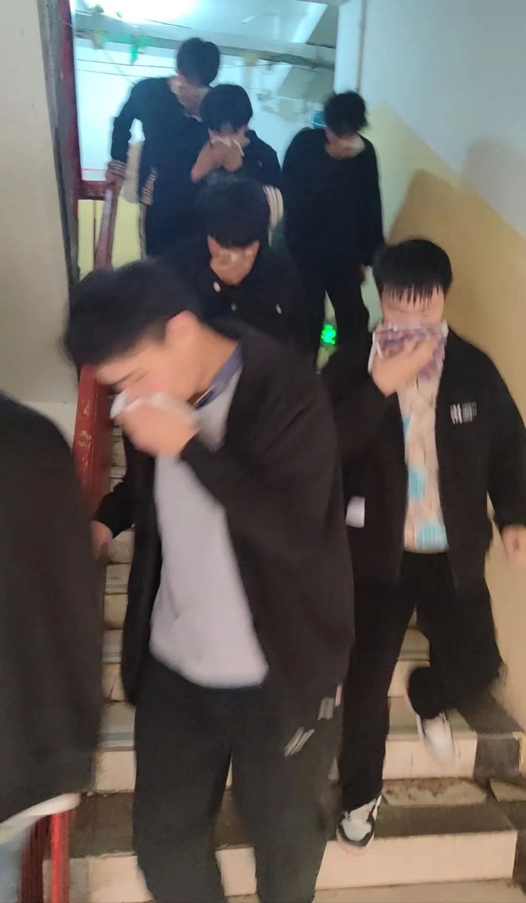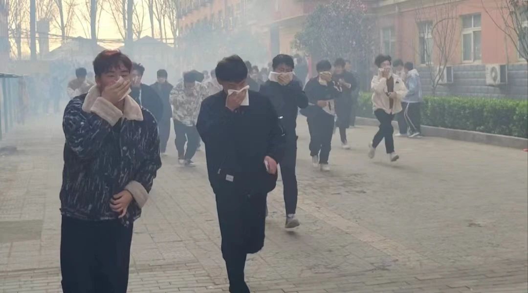 17:20隨著煙霧彈的投放,消防疏散逃生演練正式開啟。同學們反應迅速,在教員和老師們的疏導下,井然有序地沿著消防通道撤離至安全地帶。