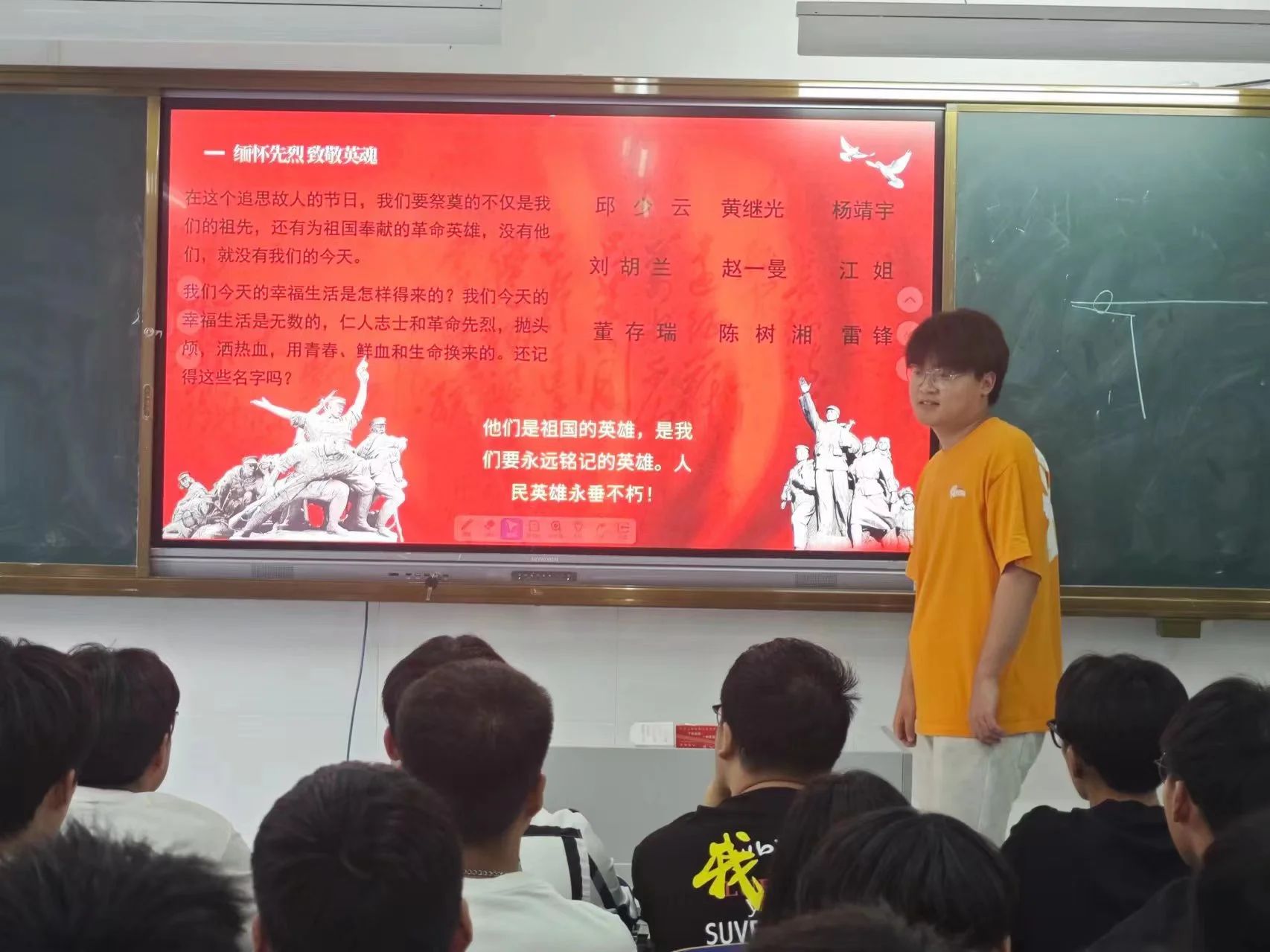 會議伊始,預(yù)備黨員馬原帶領(lǐng)大家回顧了先烈們的英勇事跡。助人為樂的雷鋒、正義凜然的劉胡蘭、解放隆化戰(zhàn)斗中舍身炸碉堡的董存瑞、燒遍全身一動不動的邱少云……一個(gè)個(gè)感人故事讓同學(xué)們聽的入神。隨后,他帶領(lǐng)大家共同觀看了致敬先烈紀(jì)念片,展現(xiàn)了革命戰(zhàn)士們浴血奮戰(zhàn)、顧全大局、視死如歸的英勇事跡,重溫了激情燃燒的歲月。