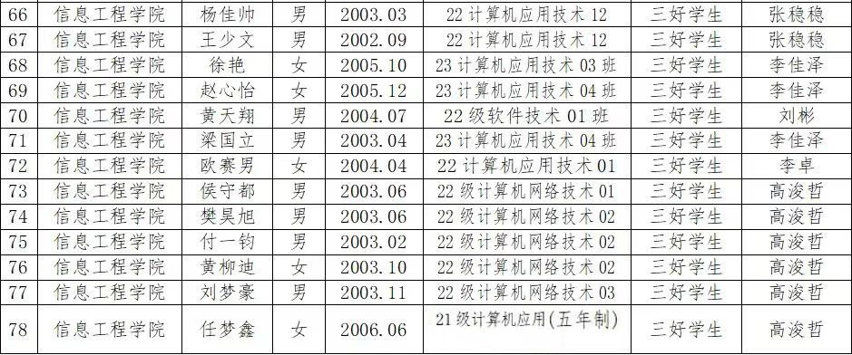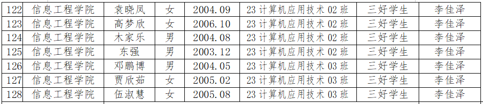 擬推薦2023級軟件技術01班等5個班級為先進班集體、劉曉璐等51人為優(yōu)秀學生干部、黃天翔等128人為三好學生,現(xiàn)將評選結果公示如下,公示期三天。