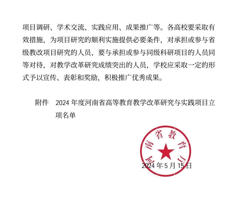 根據(jù)《關(guān)于做好 2024 年河南省高等教育教學(xué)改革研究與實踐項目立項工作的通知》(教高〔2024〕24 號):