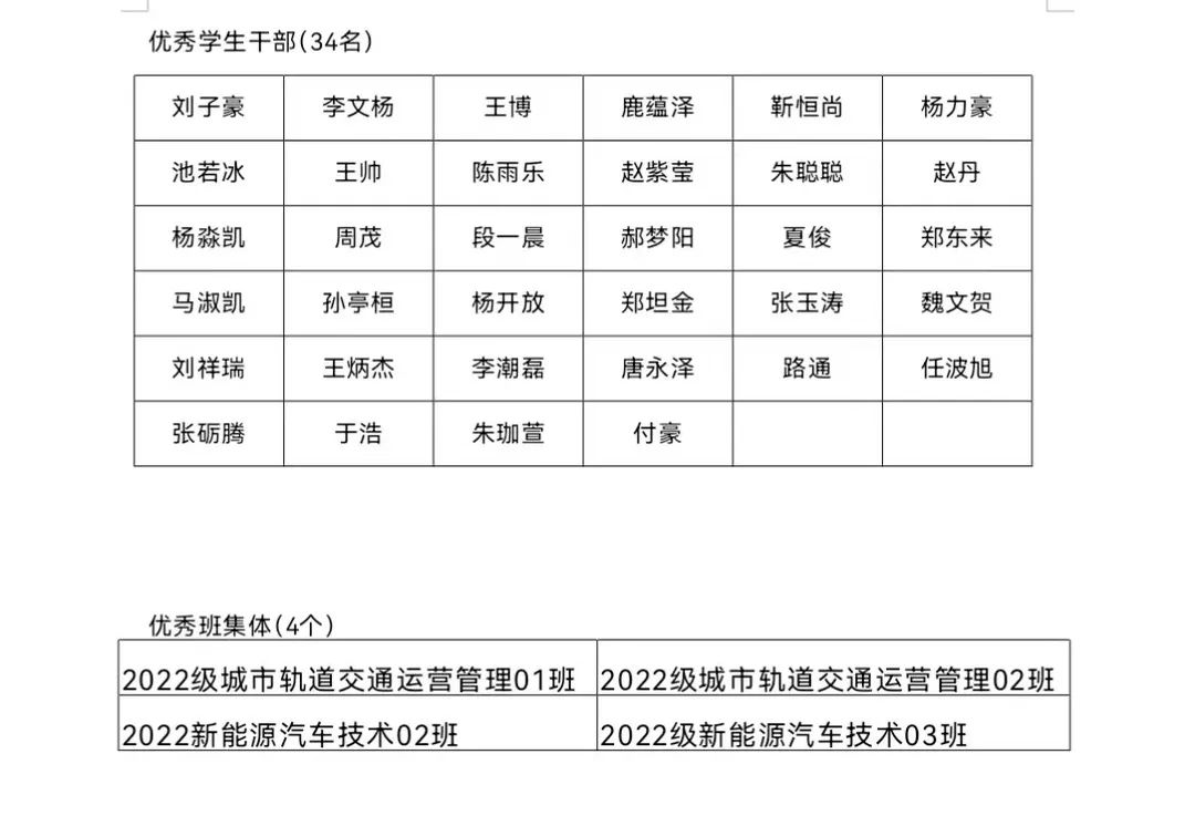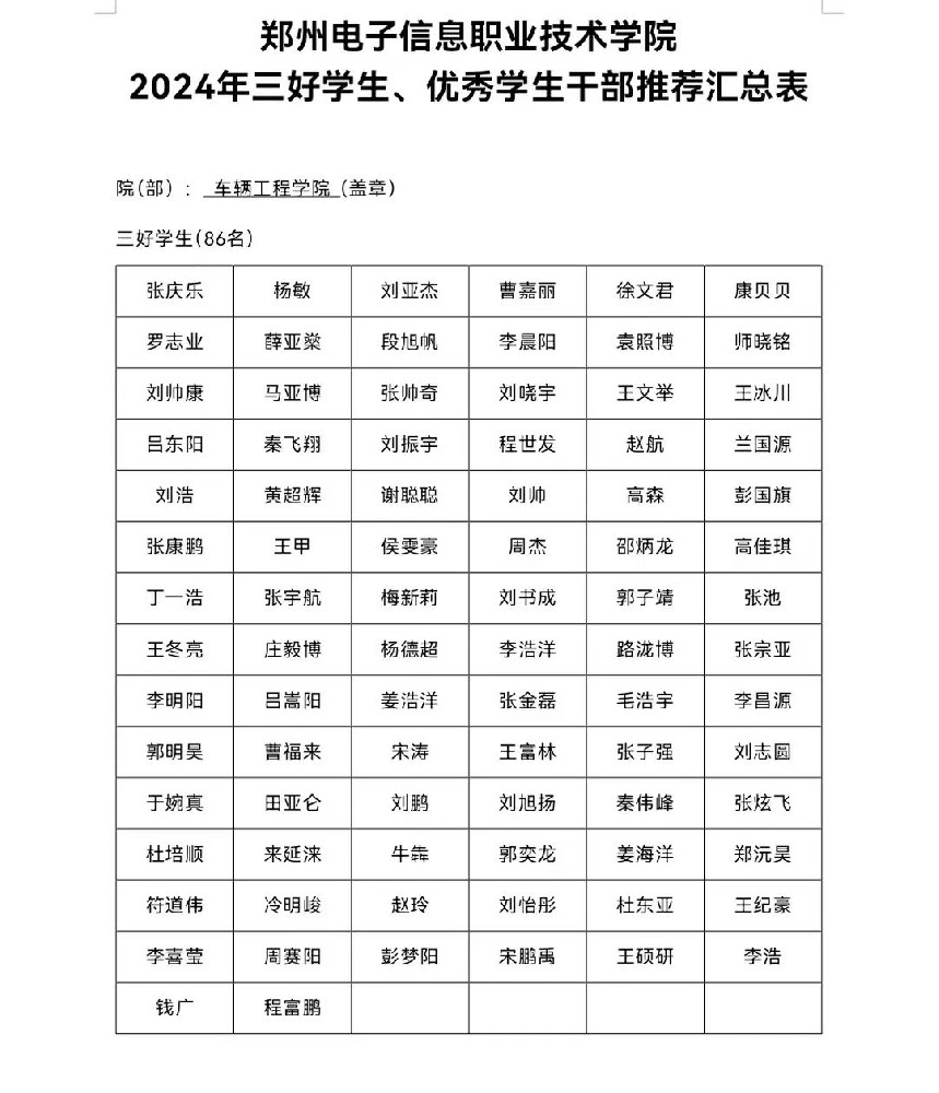 為提高學生綜合素質,樹立典型,激勵學生勤奮學習、健康成長,我院根據(jù)《鄭州電子信息職業(yè)技術學院關于評選三好學生、優(yōu)秀學生干部、先進班集體的通知》(鄭電院【2024】038號)文件要求開展2024年度校級三好學生、優(yōu)秀學生干部、先進班集體的評選工作,依據(jù)評審條件和要求,車輛工程學院內遵循公正、公平、公開的原則經個人推薦、班級評選、學院評審小組審核,擬推薦三好學生86名,優(yōu)秀學生干部34名,先進班集體4個。名單公示如下: